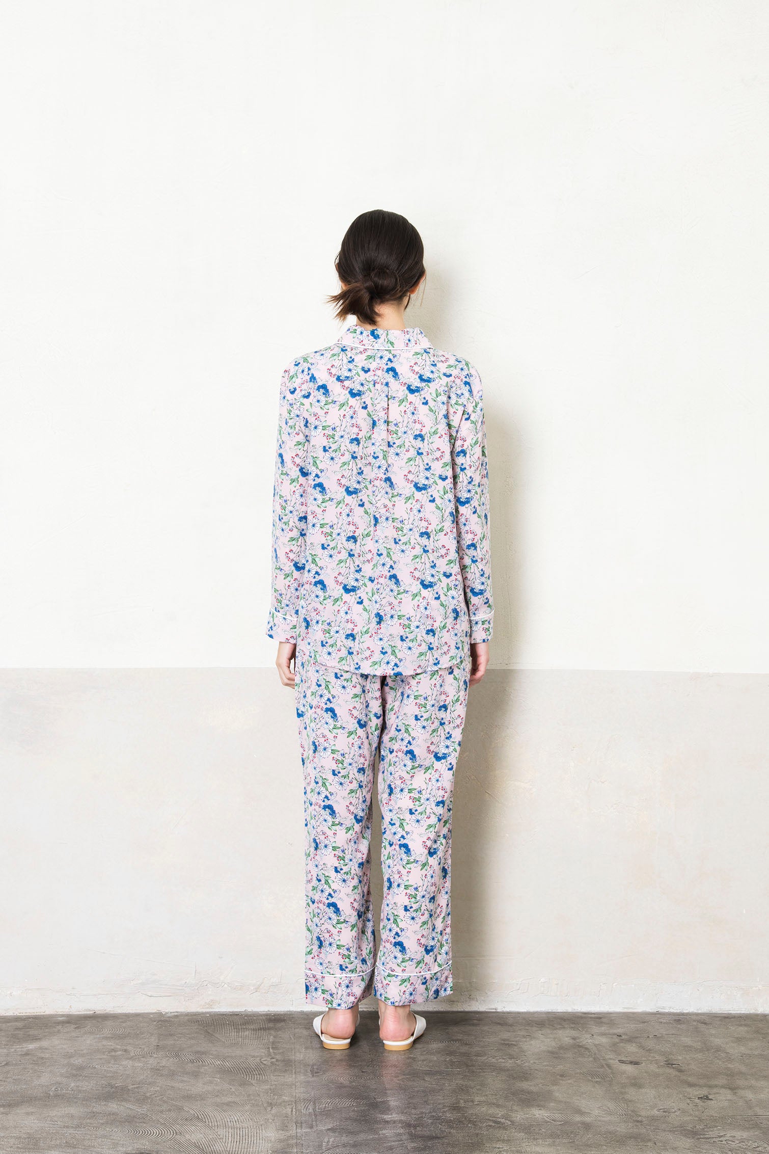 hilal ayで人気のシルクタッチ素材のフラワープリント。淡いピンクに小ぶりなフラワープリントが落ち着いた印象のトップス。肌触りや着心地が良いストレスフリーな素材で、睡眠中の寝返りもスムーズ。
