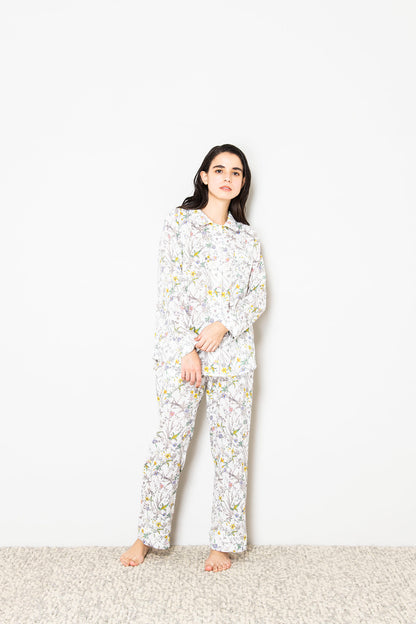 コットン、レーヨン素材でさらっと肌に優しく柔らかいタッチのハイべりカムパジャマのトップス。ボタニカルフラワープリントが清潔感UP。リップル生地の凹凸が肌に張り付きにくく、ガーゼのような風合いで着心地の良い素材。通気性も良いので年間通して使えます。