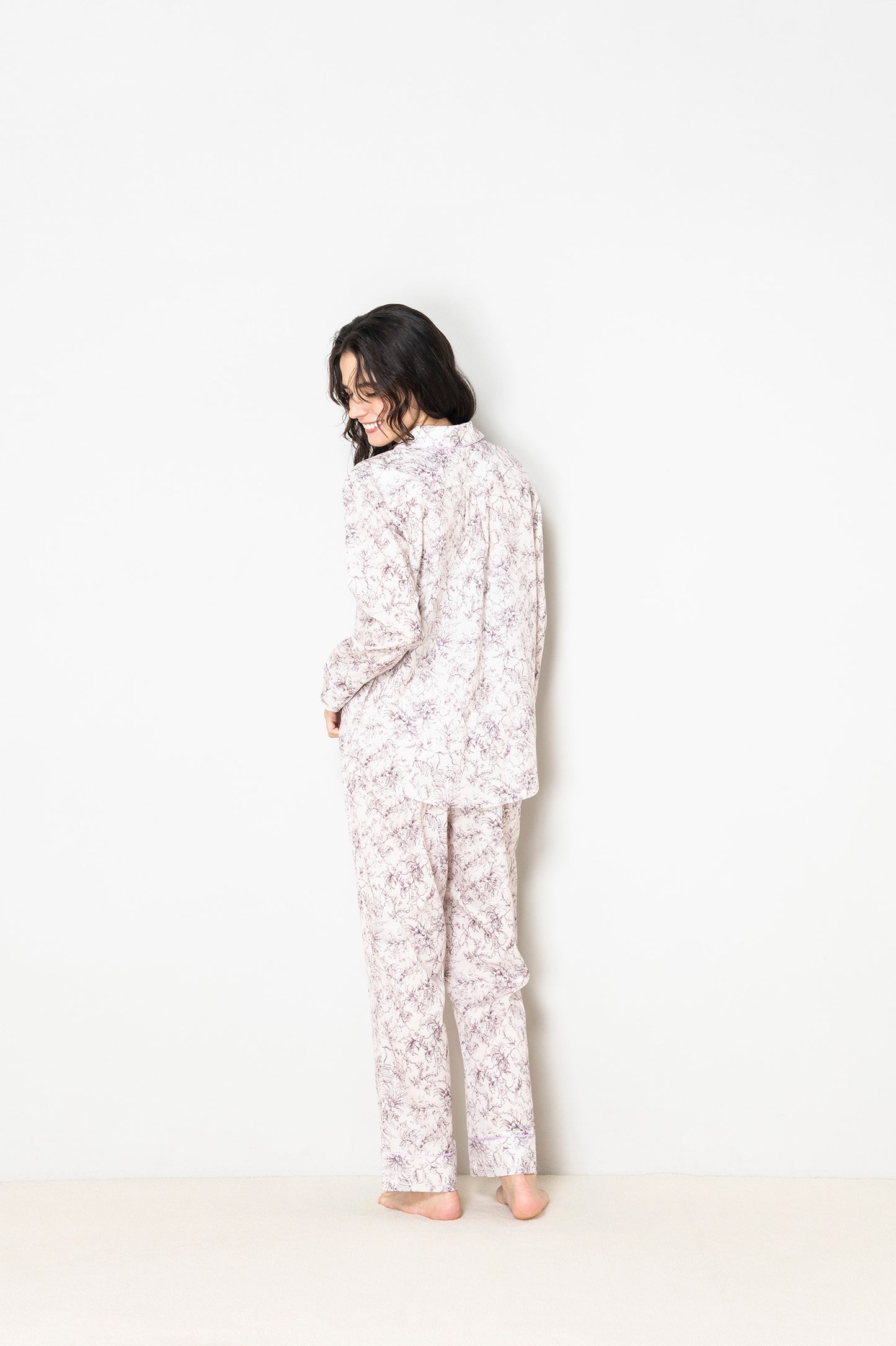 ヒララ一番人気のシルクタッチシリーズから2022AW新作柄が登場。リンドウのお花をモチーフにしたシンプルなカラーリングのパジャマトップスです。アンティーク調の柄にラベンダーのパイピングが大人可愛い雰囲気の一枚。