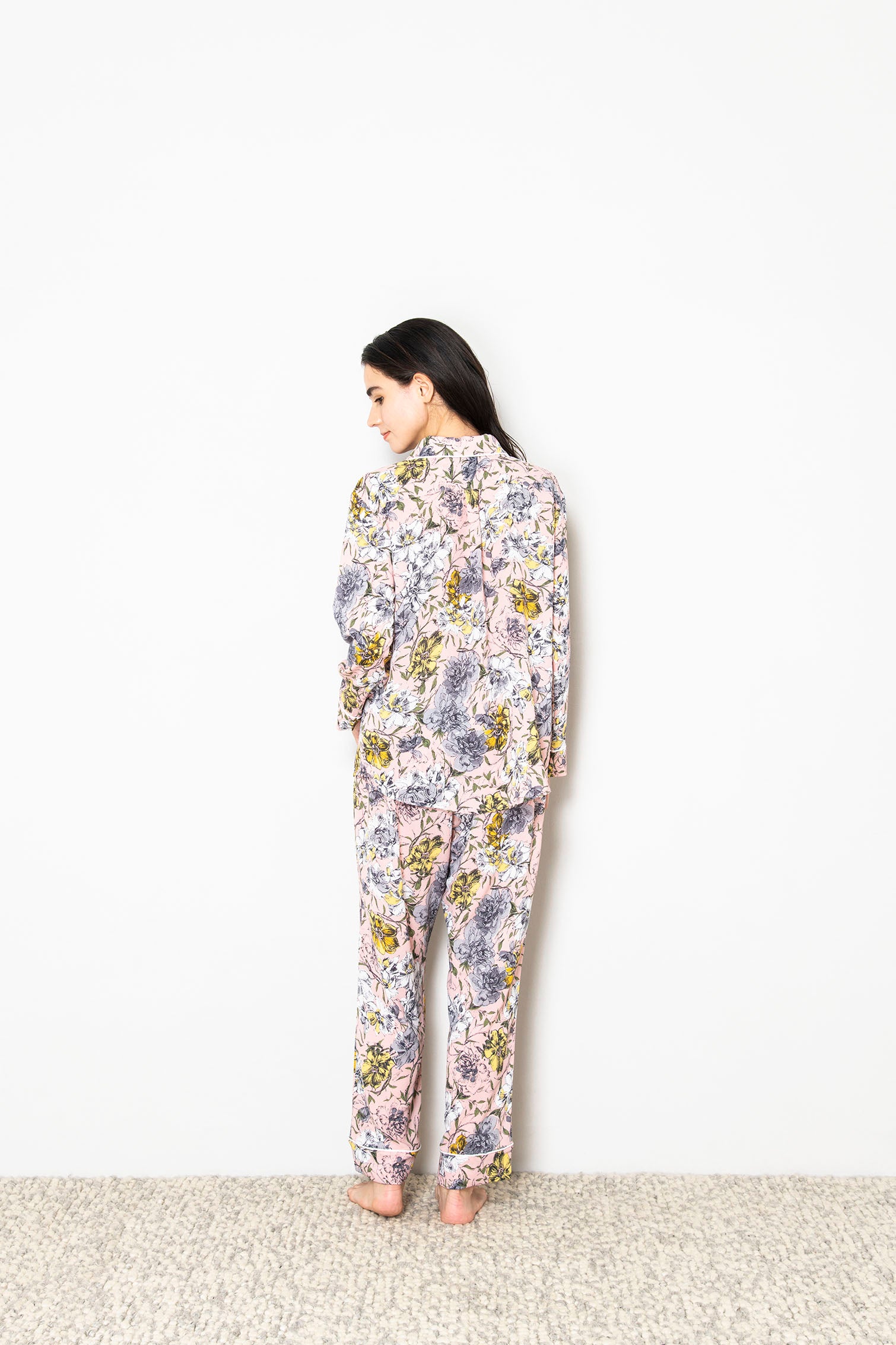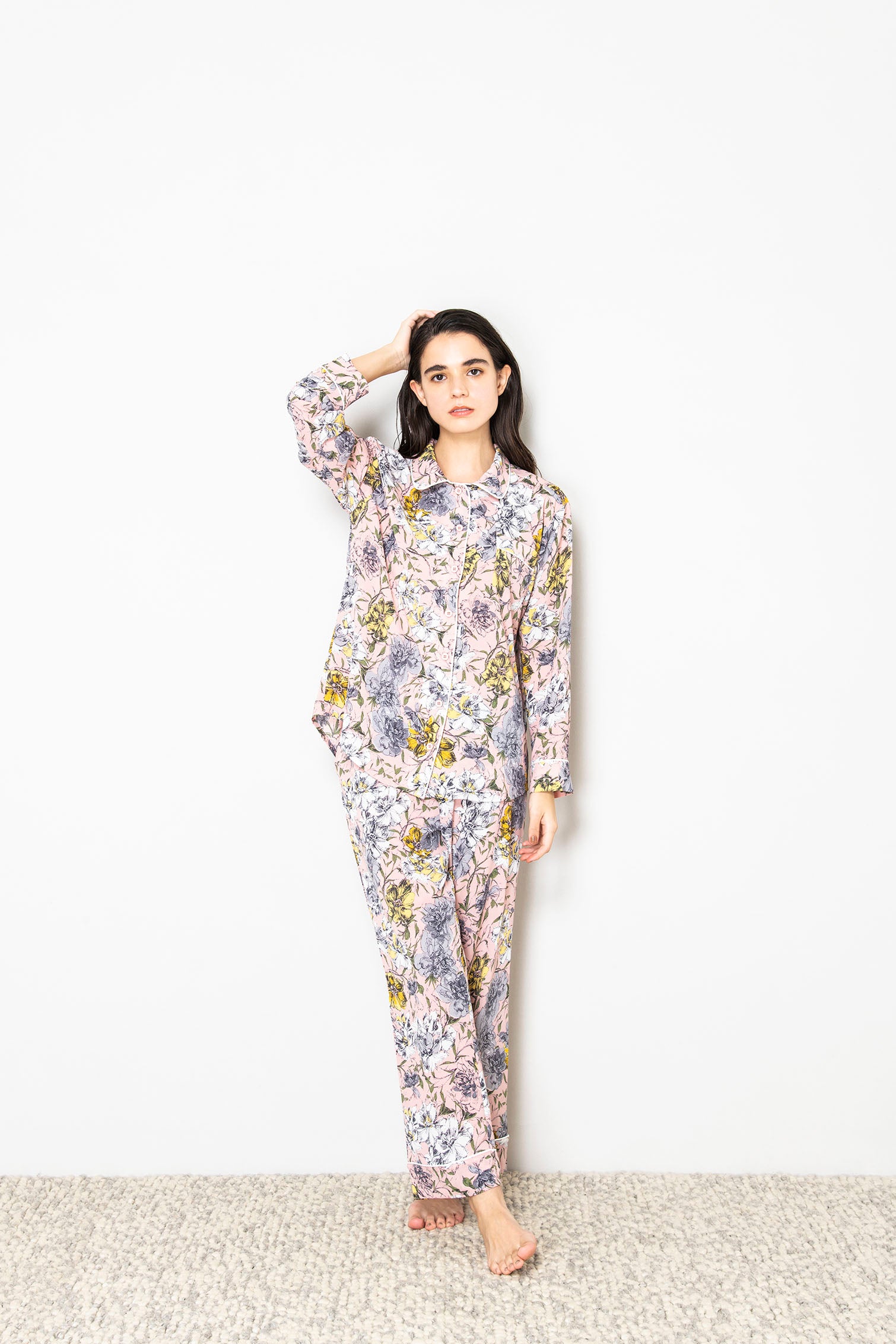 淡いピンクにグレー、イエローの花柄がパステルピンクをぐっと大人の女性らしい印象に。白のパイピングが清潔感をup。シルクジョーゼットのようなシャリ感と透け感のある素材です。