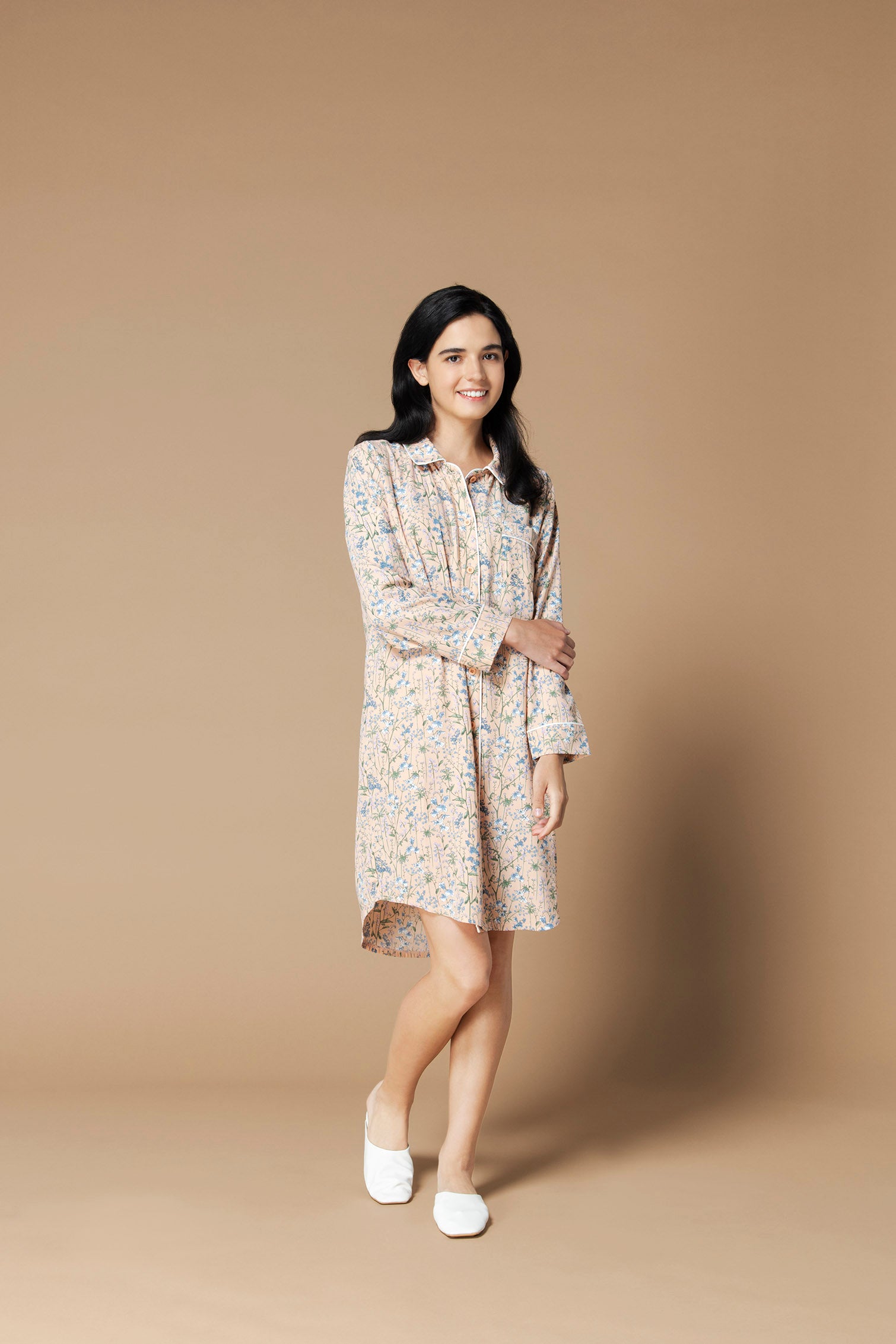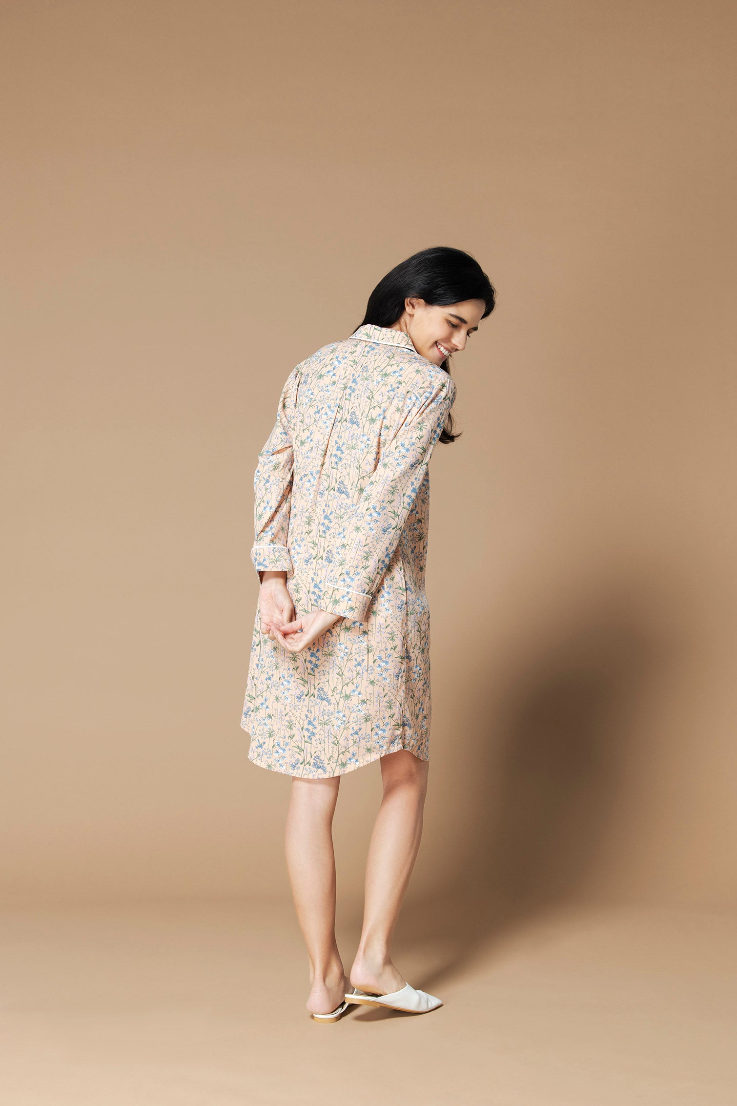 青紫の凛とした花を咲かせるファリナセアがプリントされたシルクタッチのパジャマワンピース。ピンクのボディに存在感のあるファリナセアの花が、優しくもあり、その存在感も感じさせるデザインとなっています。条件次第では1年中花を咲かせる種で、その花の色味から、生命力をとても感じる花です。