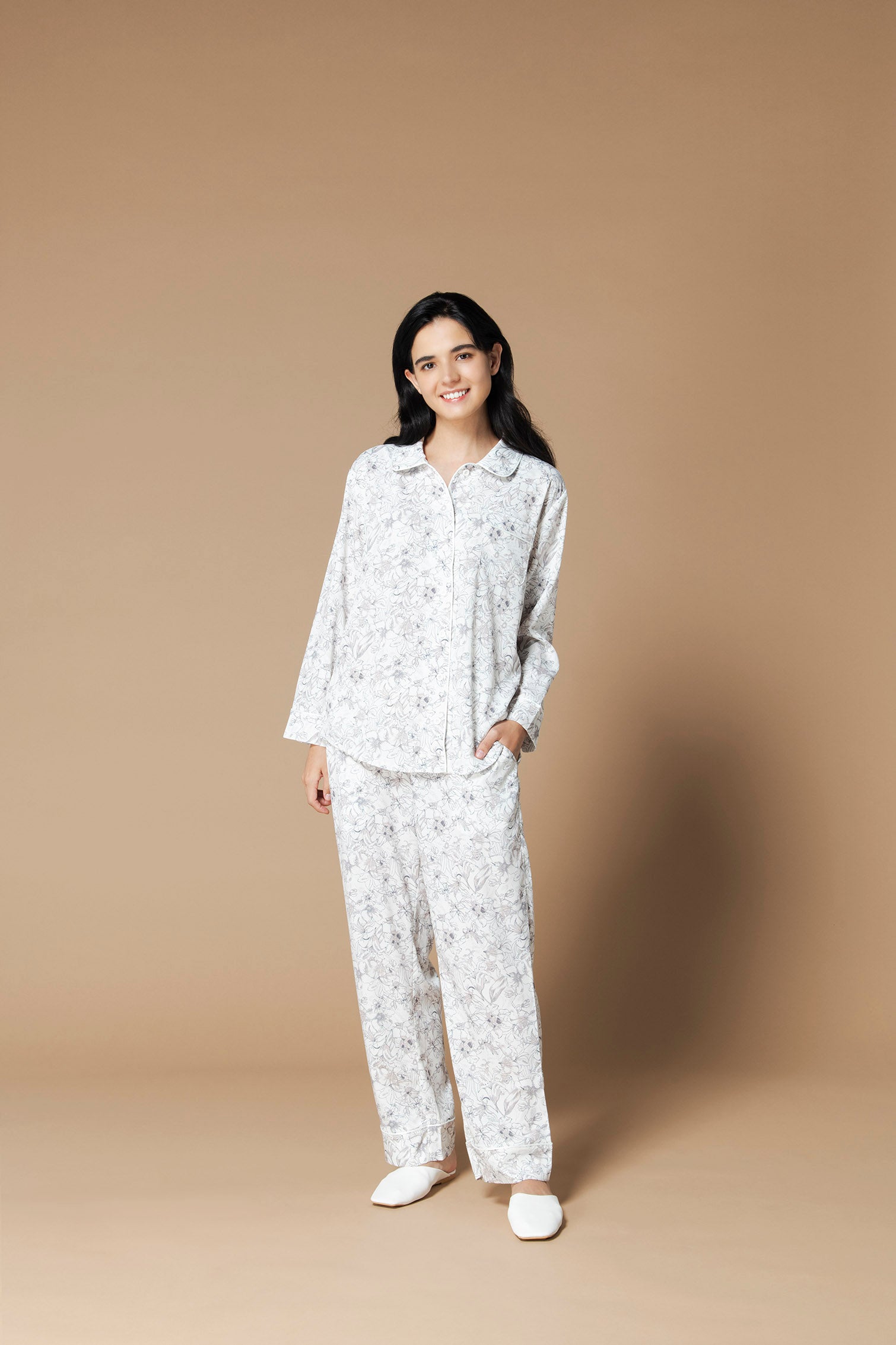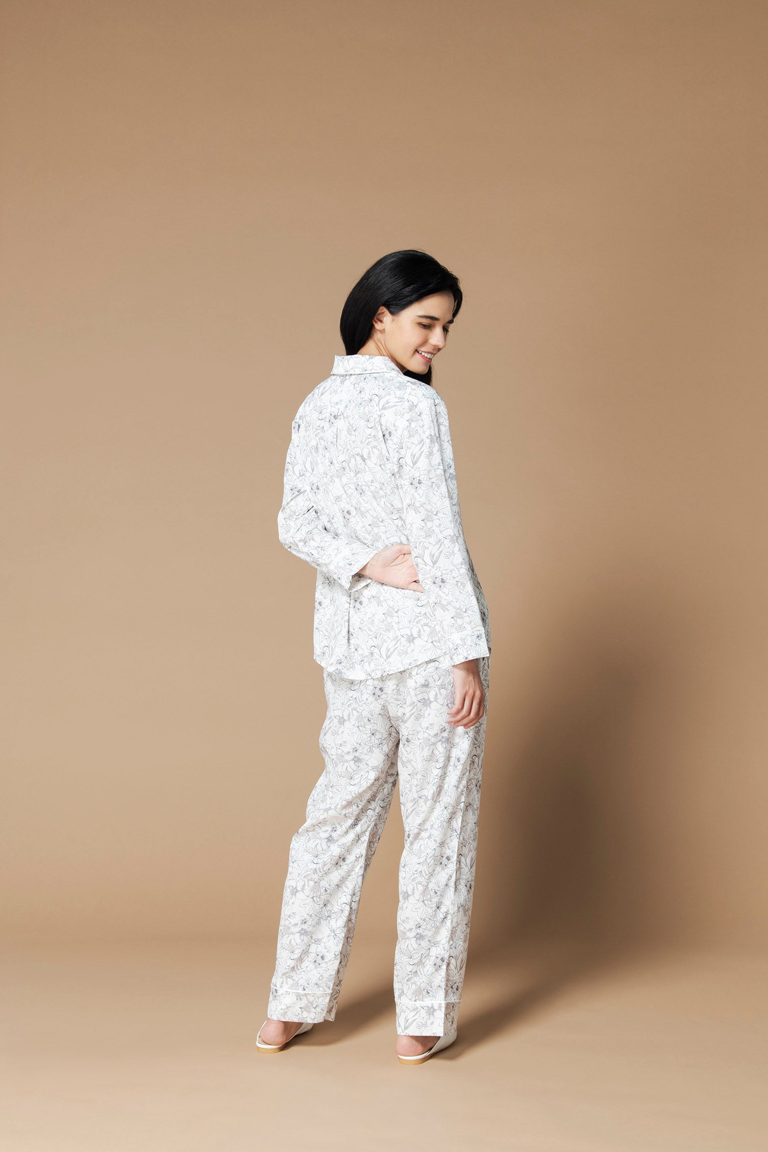 白く美しいアンベラタムがプリントされた、シルクタッチのパジャマトップス。白のボディにさりげなく施されたアンベラタムは、おしゃれで落ち着いた印象を与えてくれます。欧米諸国では観賞用にアンベラタムを栽培している宮殿も多く、その美しさは万国共通とも言えます。