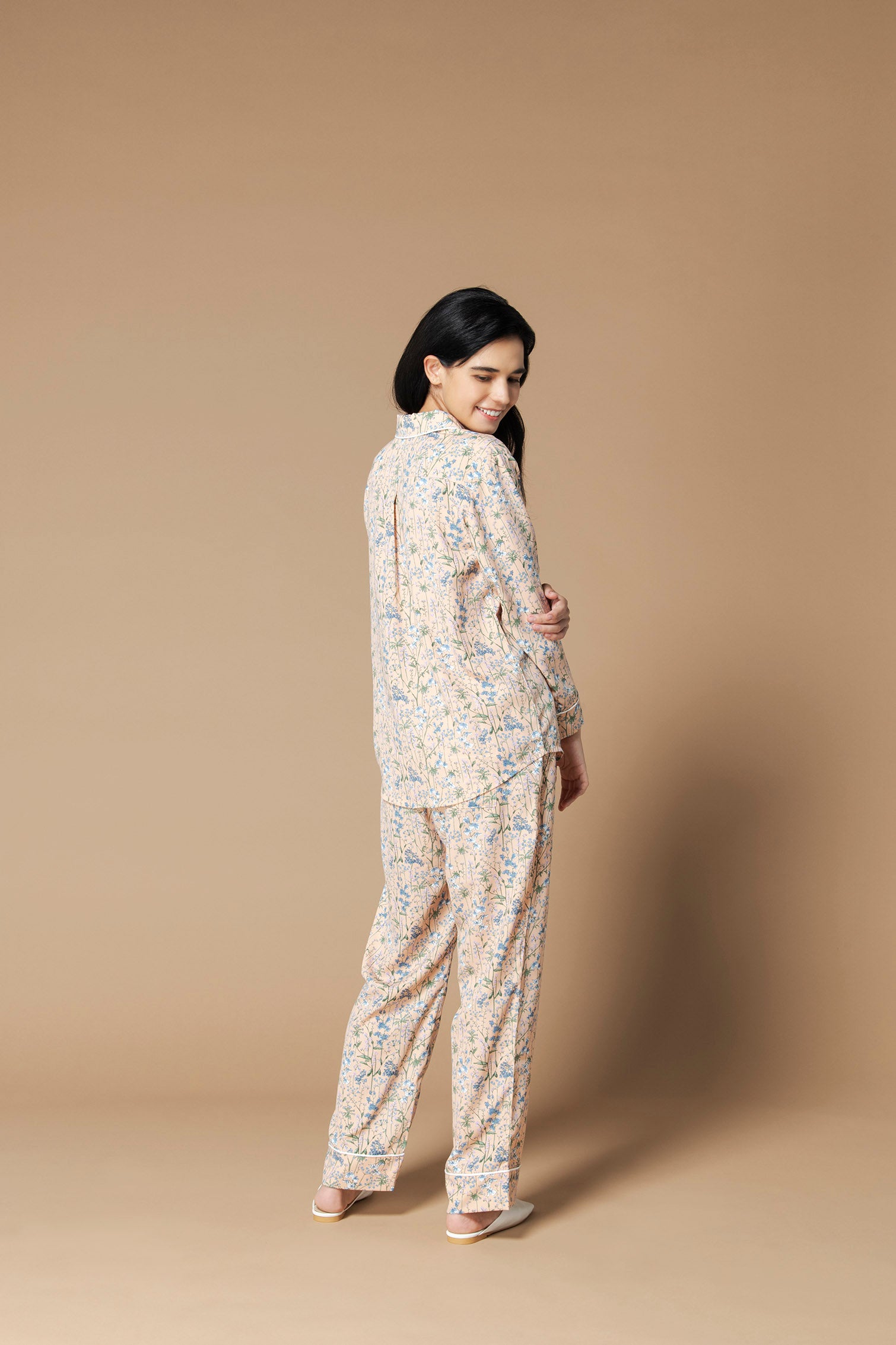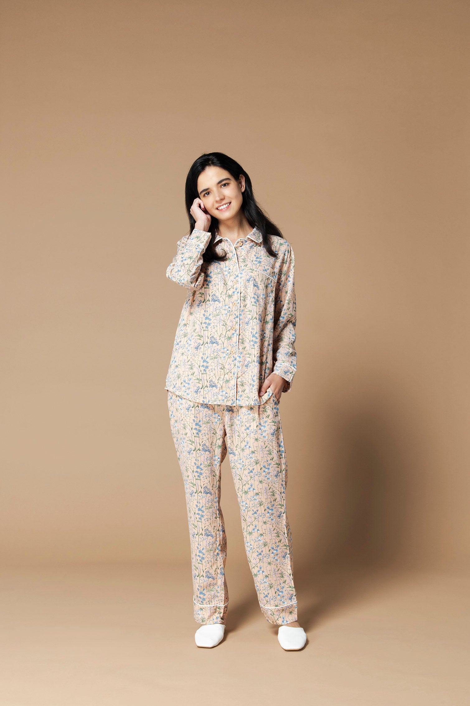 青紫の凛とした花を咲かせるファリナセアがプリントされたシルクタッチのパジャマワンピース。ピンクのボディに存在感のあるファリナセアの花が、優しくもあり、その存在感も感じさせるデザインとなっています。条件次第では1年中花を咲かせる種で、その花の色味から、生命力をとても感じる花です。