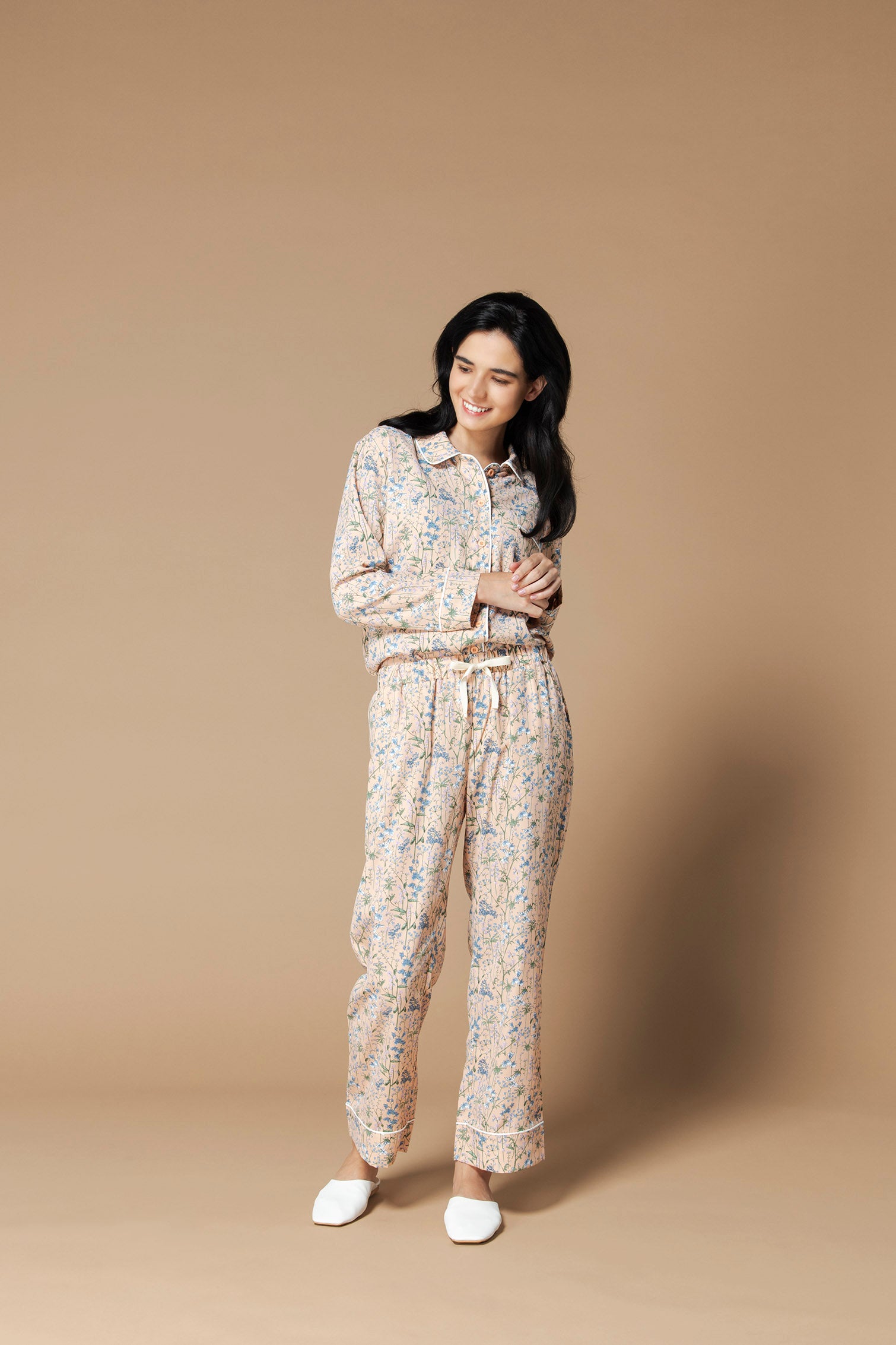 青紫の凛とした花を咲かせるファリナセアがプリントされたシルクタッチのパジャマワンピース。ピンクのボディに存在感のあるファリナセアの花が、優しくもあり、その存在感も感じさせるデザインとなっています。条件次第では1年中花を咲かせる種で、その花の色味から、生命力をとても感じる花です。