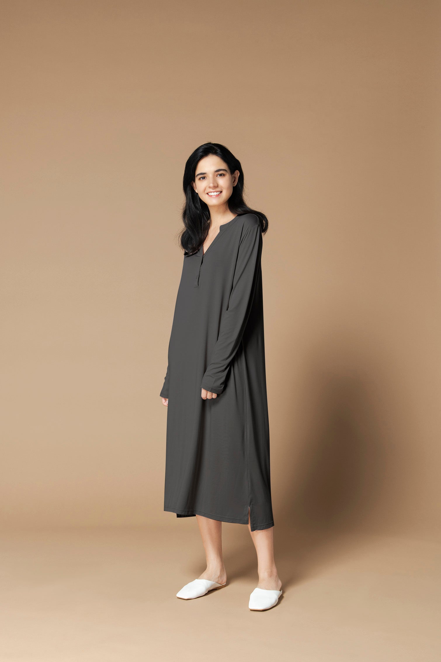 プレーンモダール素材のワンピースから、ヘンリーネックタイプが新登場。