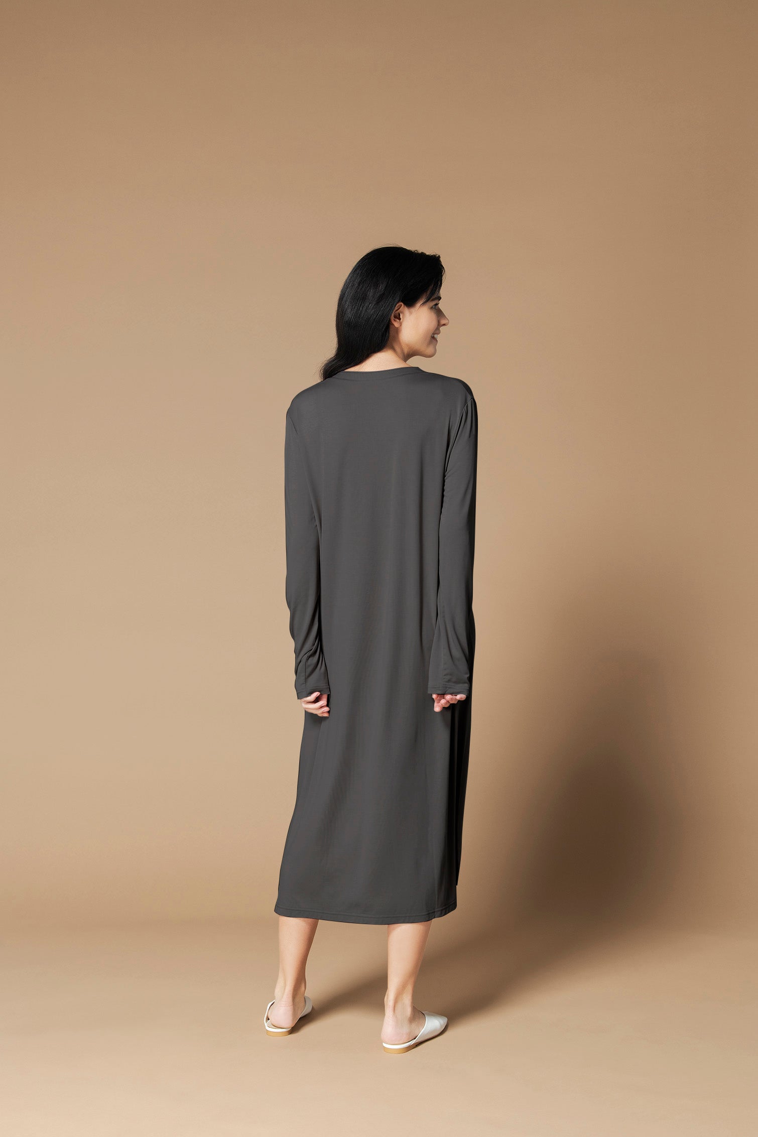ヘンリーネックは首元を綺麗にみせ、上品さ漂う着こなしにしてくれます。モダール素材のドレープ感があり、首の開きや、肩回りにストレスのないフィット感で作られています。洗濯での型崩れも無く、デイリーに使いたいワンピースです。どんなシーンでも使いやすい、着心地の良いアイテムです。