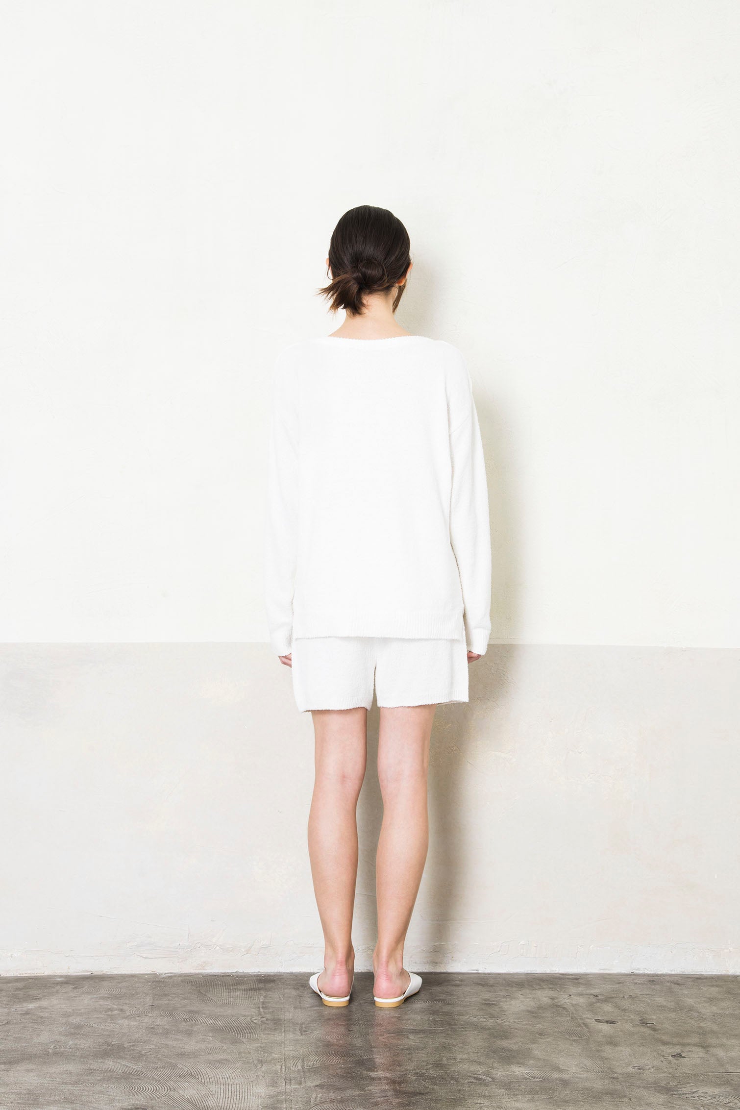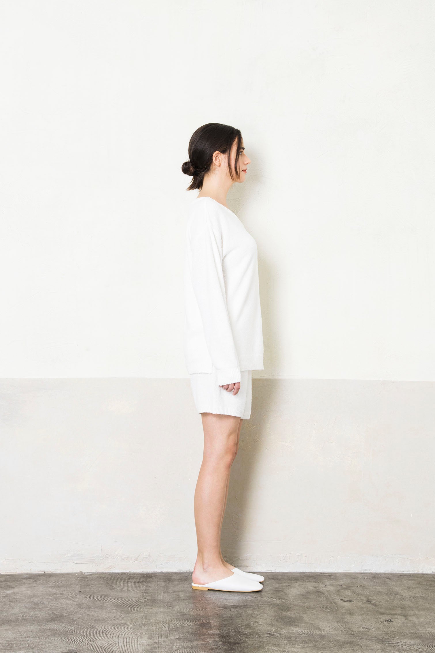 シンプルなVネックはデコルテをすっきりと綺麗に見せてくれ、どんなボトムスにも合わせやすいデザイン。ゆったりとしたアームホールもリラックススタイルには欠かせません。素材感を最大限に楽しんで頂けるように飽きの来ない普遍的なデザインに仕上げました。