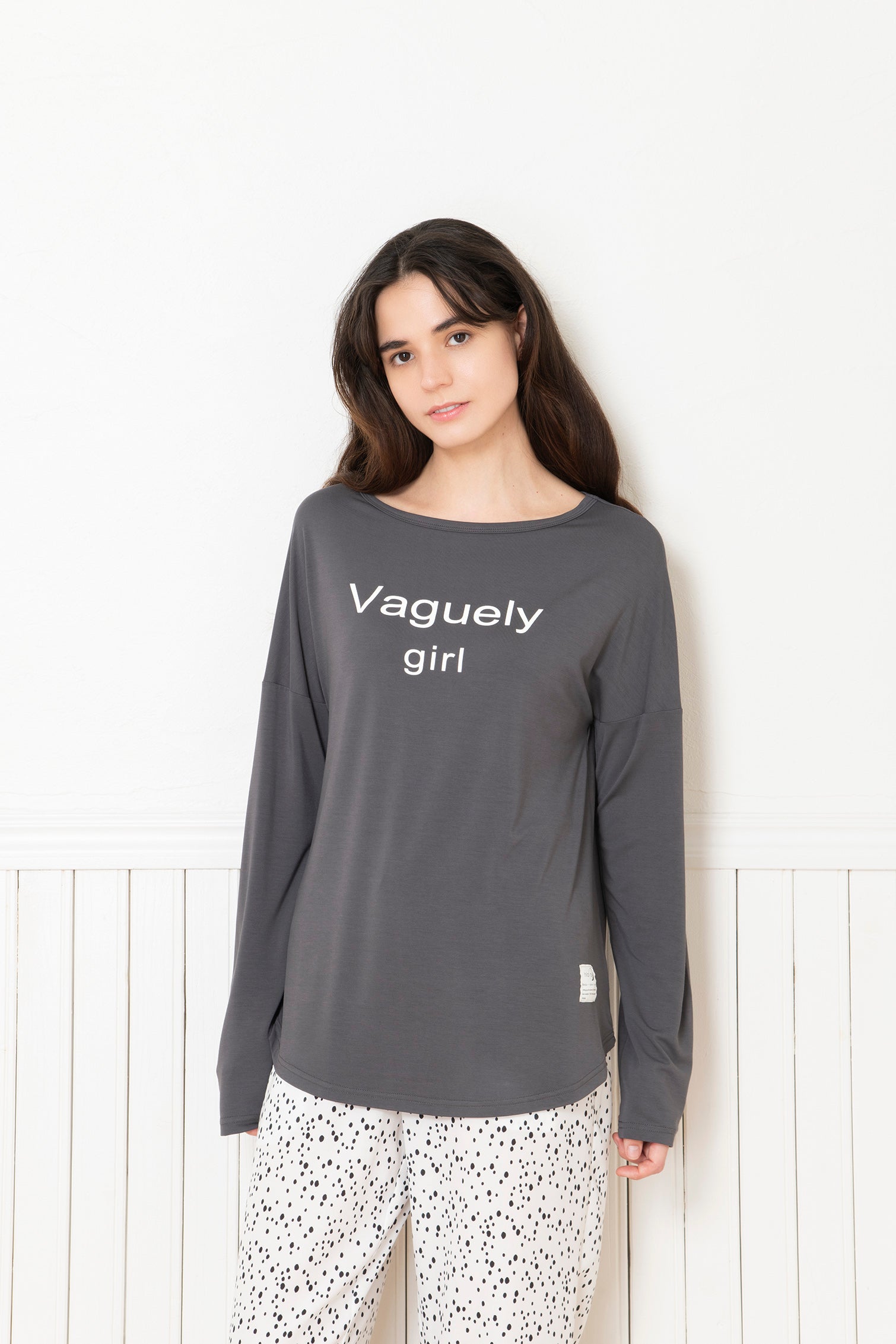 ・ヒララの柄のパンツやリブパンツのボトムに合わせて、リラックススタイル。
