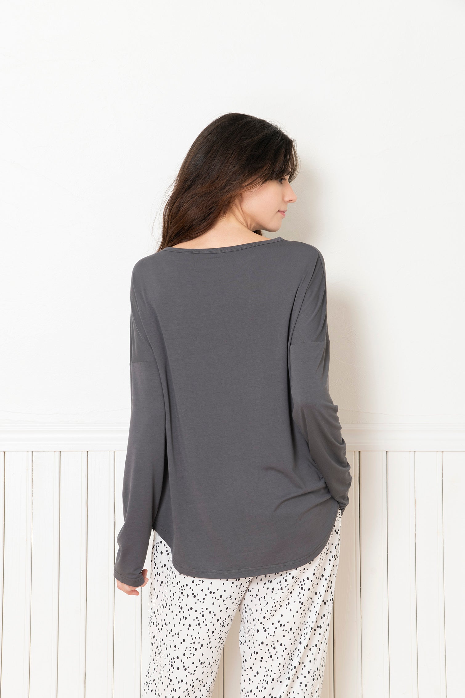 袖入れしたときのスルッと袖が通る着心地は病みつきになります。モダール素材のドレープ感があり、首の開きや、肩回りにストレスのないフィット感で作られています。洗濯での型崩れも無く、デイリーに使いたいトップスです。どんなシーンでも使いやすい、着心地の良いアイテムです。
