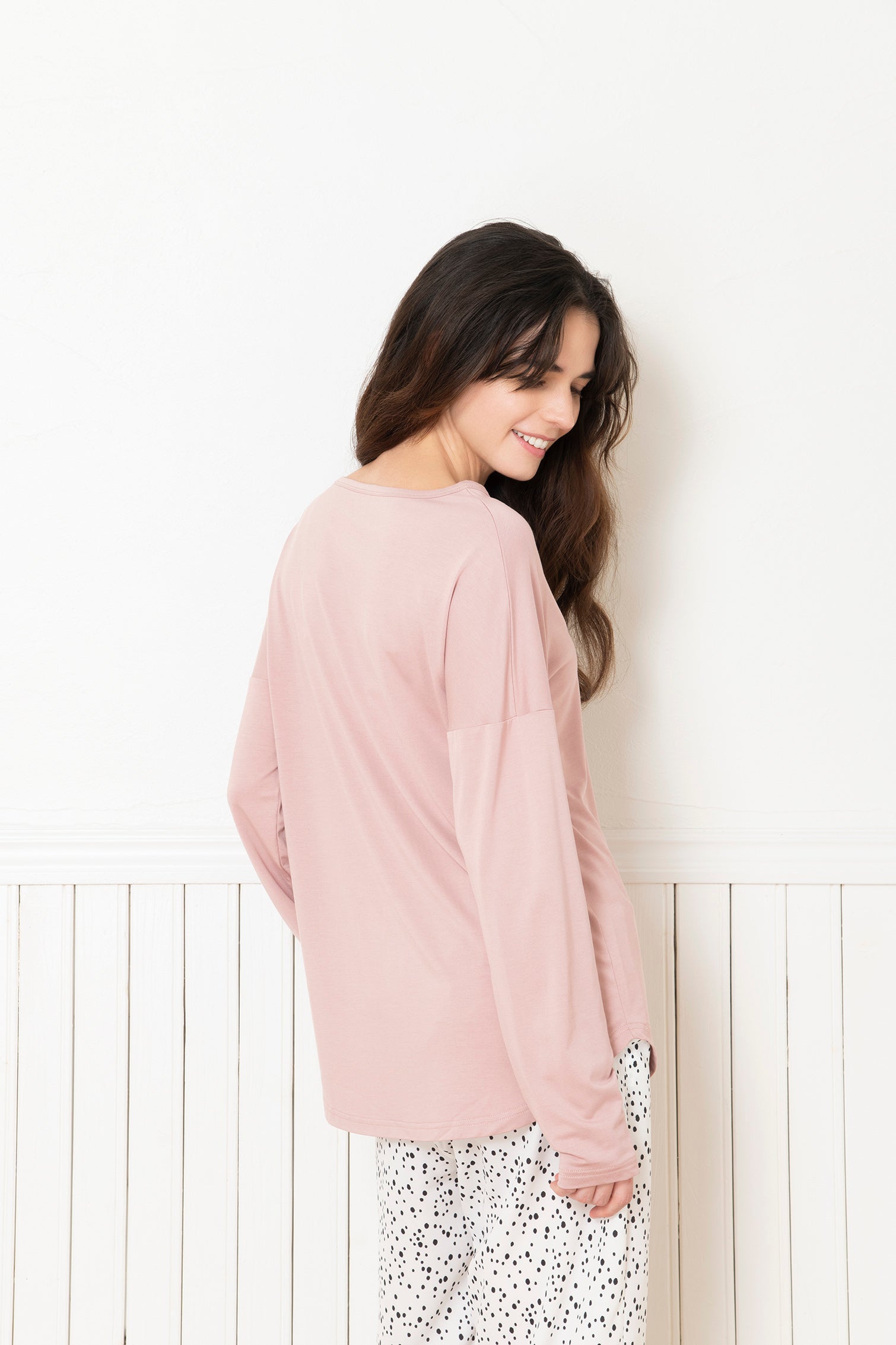 袖入れしたときのスルッと袖が通る着心地は病みつきになります。モダール素材のドレープ感があり、首の開きや、肩回りにストレスのないフィット感で作られています。洗濯での型崩れも無く、デイリーに使いたいトップスです。どんなシーンでも使いやすい、着心地の良いアイテムです。