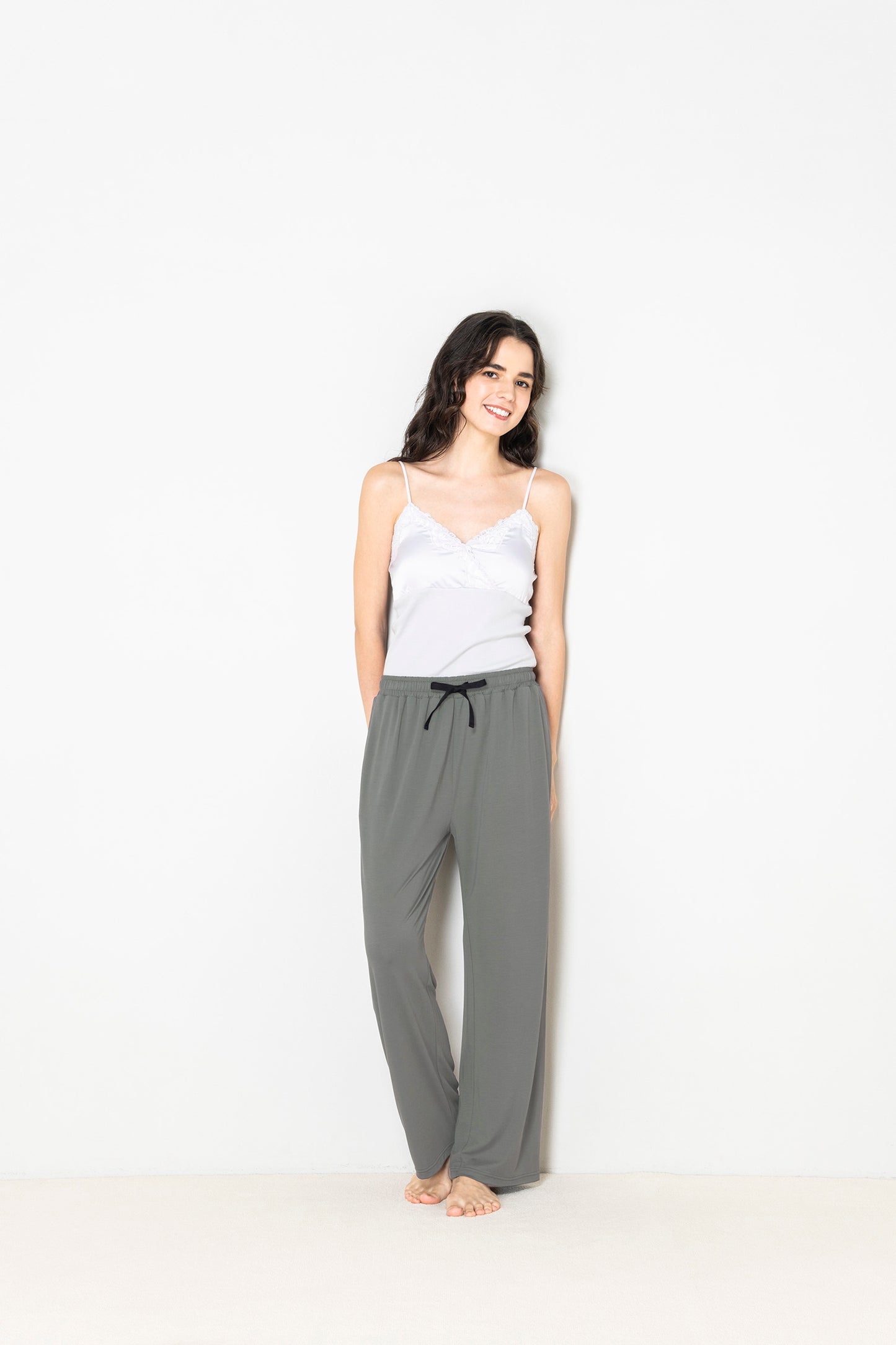モダール素材特有のドレープ感のある生地感は、体のラインを拾わないシルエットで、さらっと心地よく着用頂けます。ウエスト部分はゴムデザインでリラックス感のある仕上がりです。