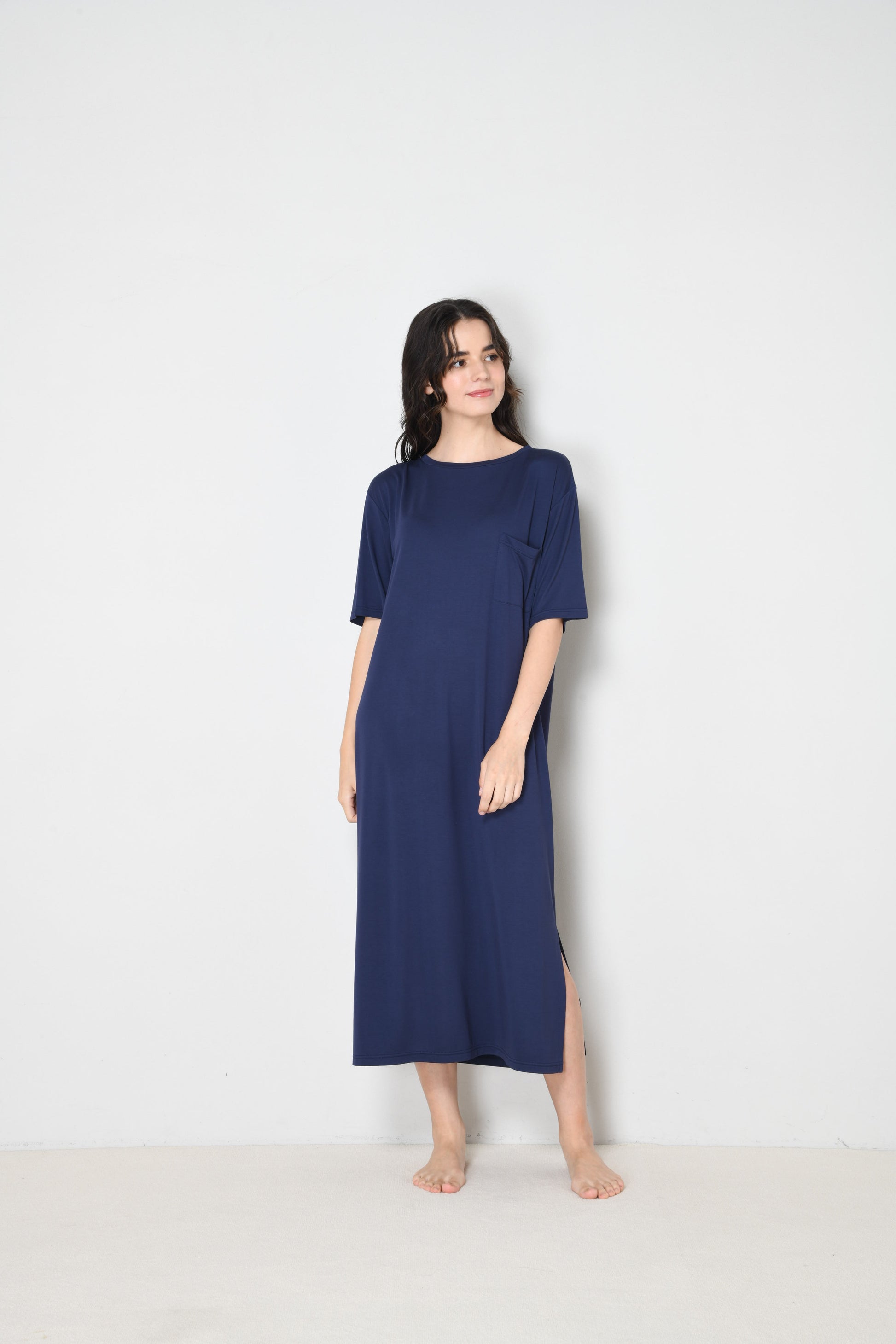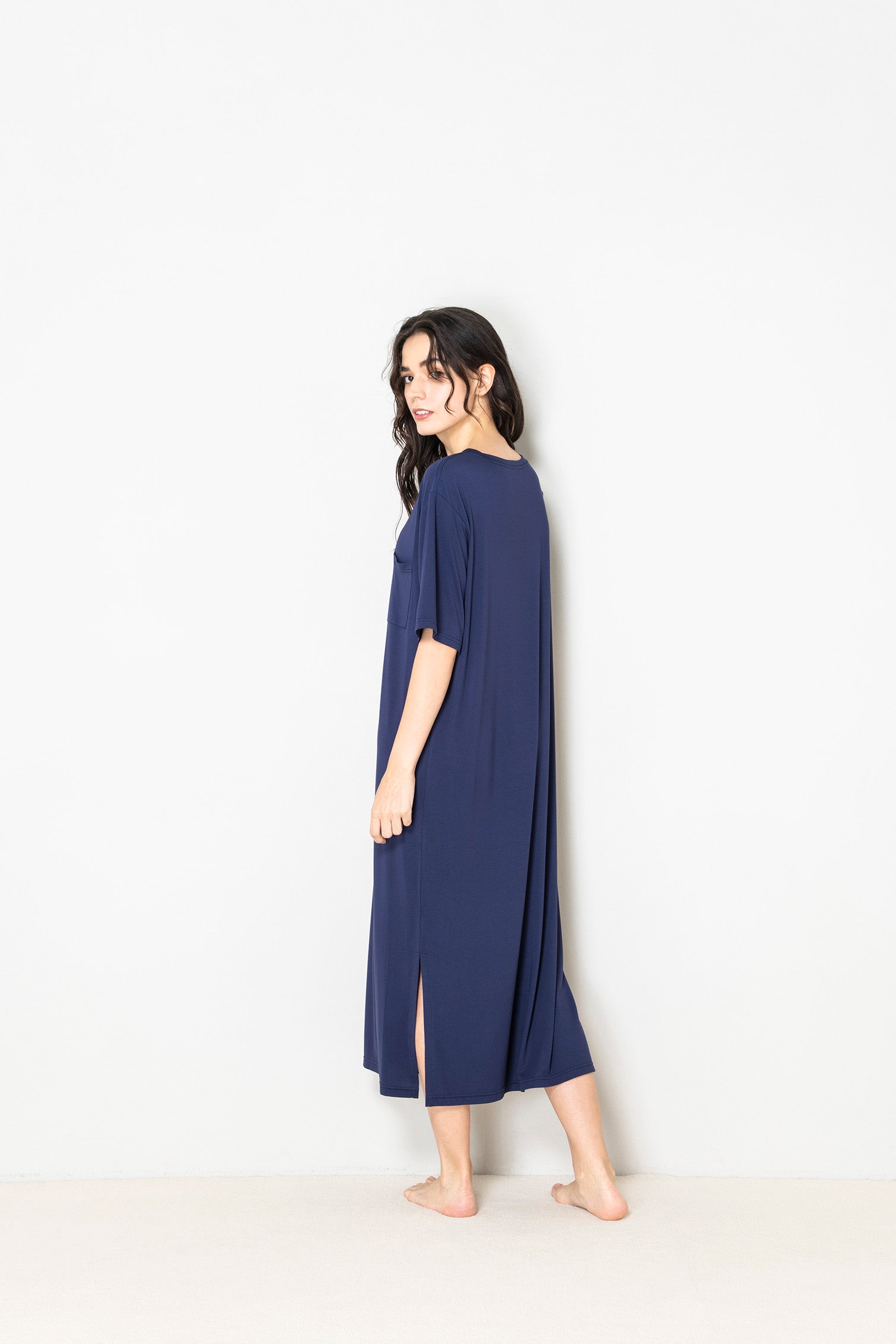 モダール素材特有のドレープ感のある生地感は高級感があり、首の開き、肩回りにストレスの無いフィット感で作られています。ゆるやかなネックラインで抜け感があり、体のラインを拾わないシルエットで、さらっと心地よく着用頂けます。耐久性にも優れ、型崩れしにくく速乾性のある素材でデイリーに使えるワンピースです。