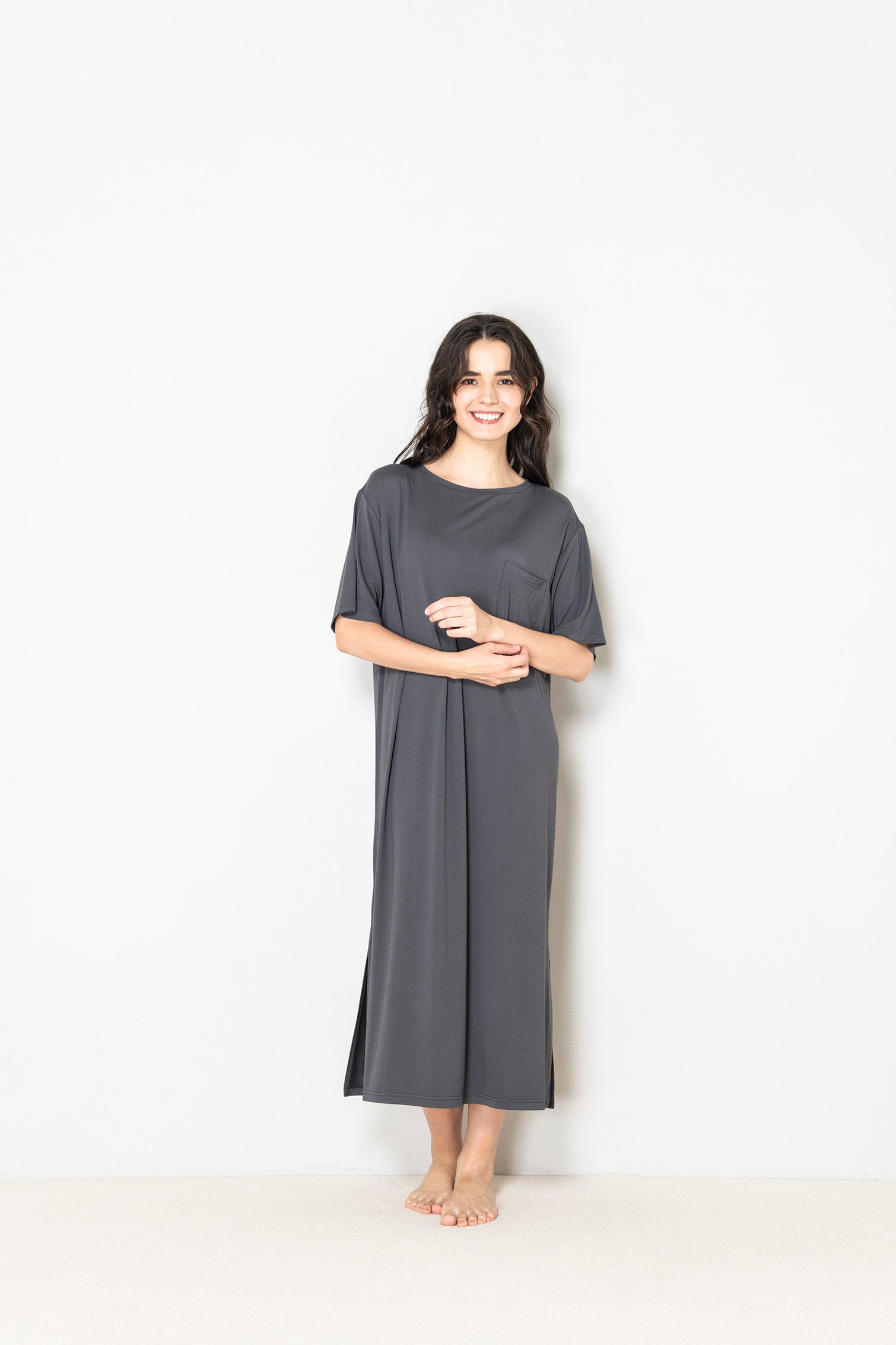 モダール素材特有のドレープ感のある生地感は高級感があり、首の開き、肩回りにストレスの無いフィット感で作られています。ゆるやかなネックラインで抜け感があり、体のラインを拾わないシルエットで、さらっと心地よく着用頂けます。耐久性にも優れ、型崩れしにくく速乾性のある素材でデイリーに使えるワンピースです。