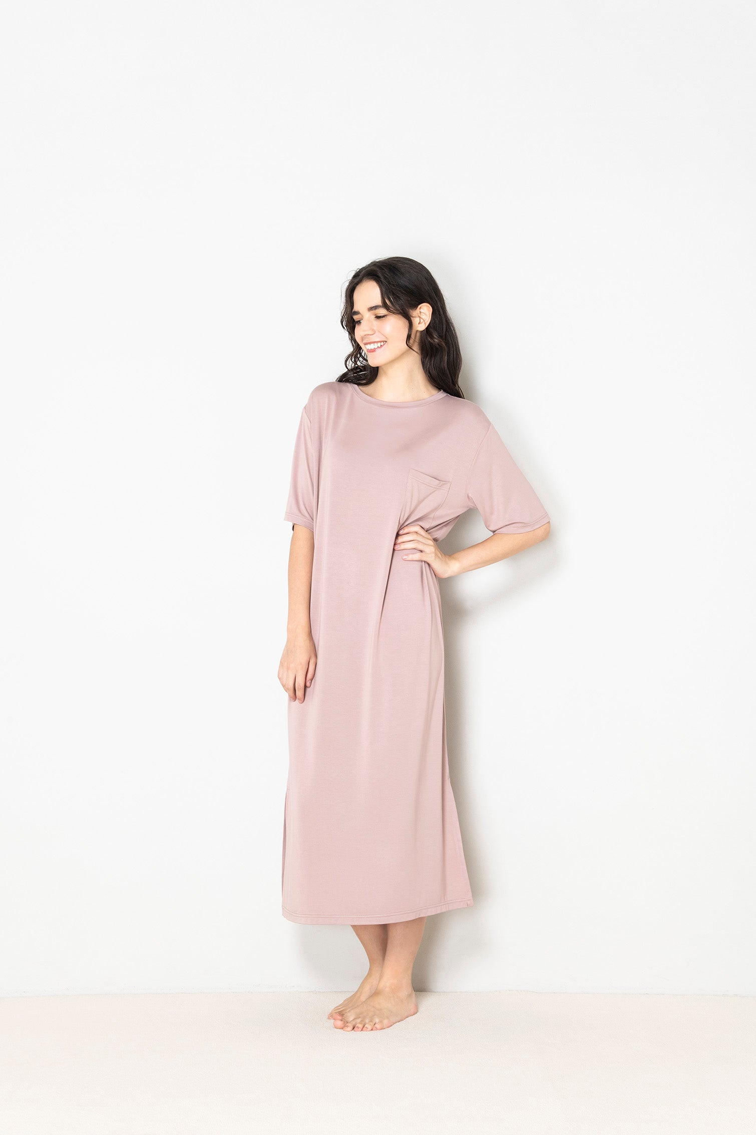 モダール素材特有のドレープ感のある生地感は高級感があり、首の開き、肩回りにストレスの無いフィット感で作られています。ゆるやかなネックラインで抜け感があり、体のラインを拾わないシルエットで、さらっと心地よく着用頂けます。耐久性にも優れ、型崩れしにくく速乾性のある素材でデイリーに使えるワンピースです。