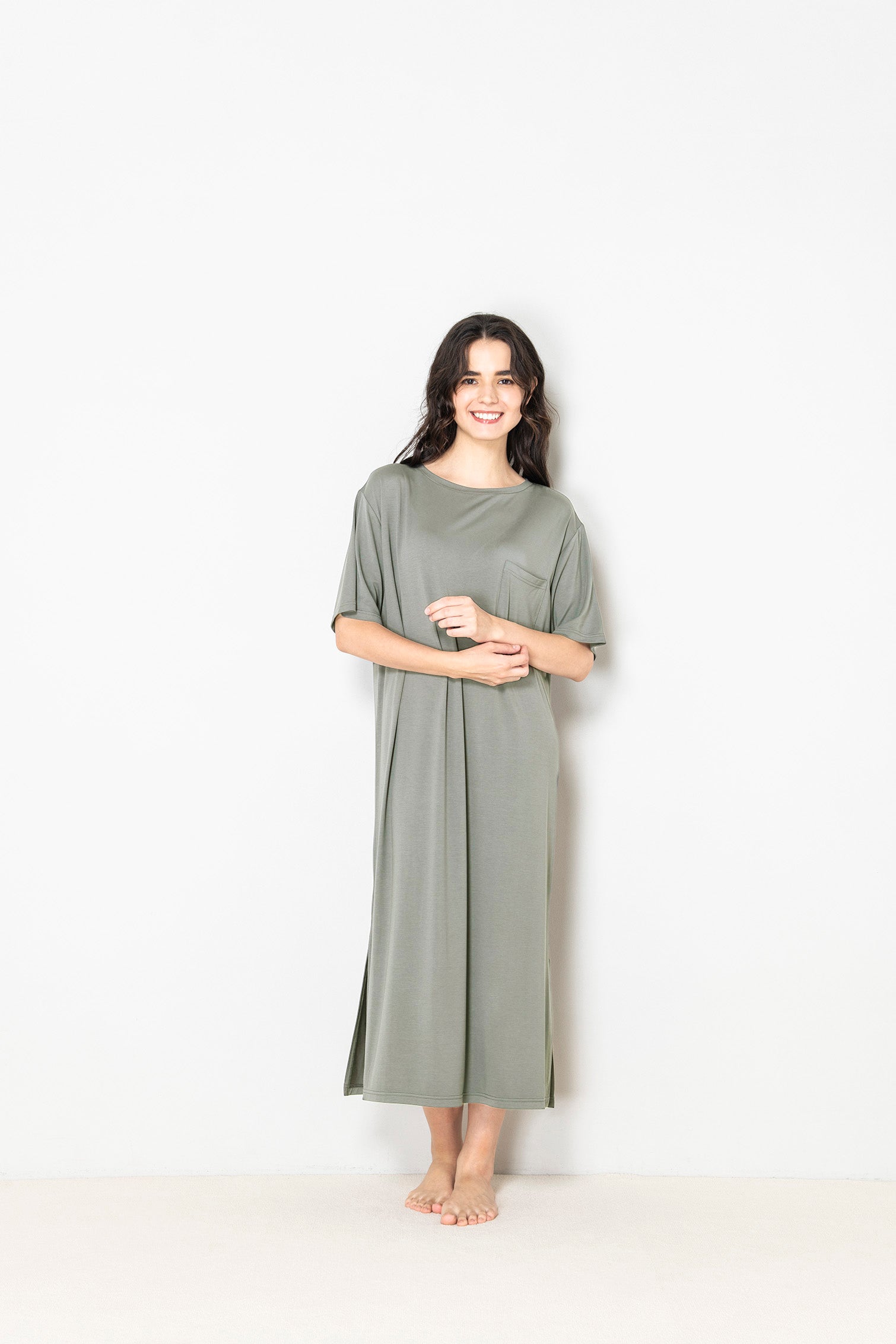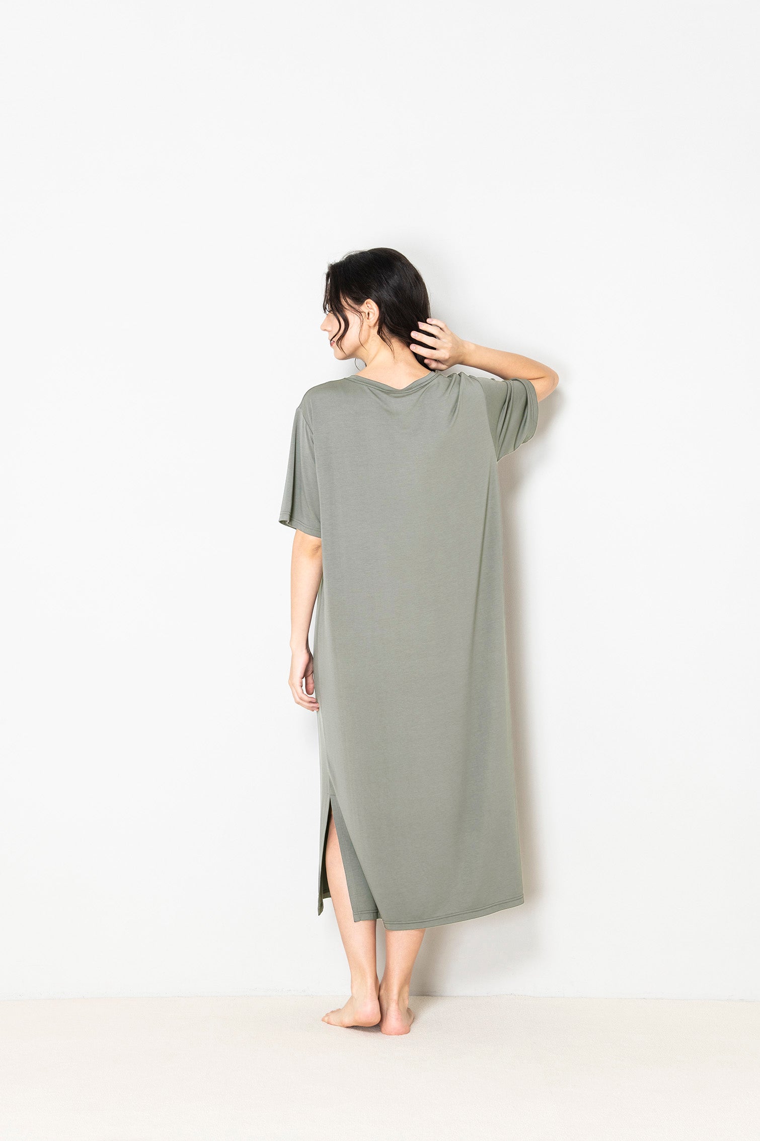 モダール素材特有のドレープ感のある生地感は高級感があり、首の開き、肩回りにストレスの無いフィット感で作られています。ゆるやかなネックラインで抜け感があり、体のラインを拾わないシルエットで、さらっと心地よく着用頂けます。耐久性にも優れ、型崩れしにくく速乾性のある素材でデイリーに使えるワンピースです。