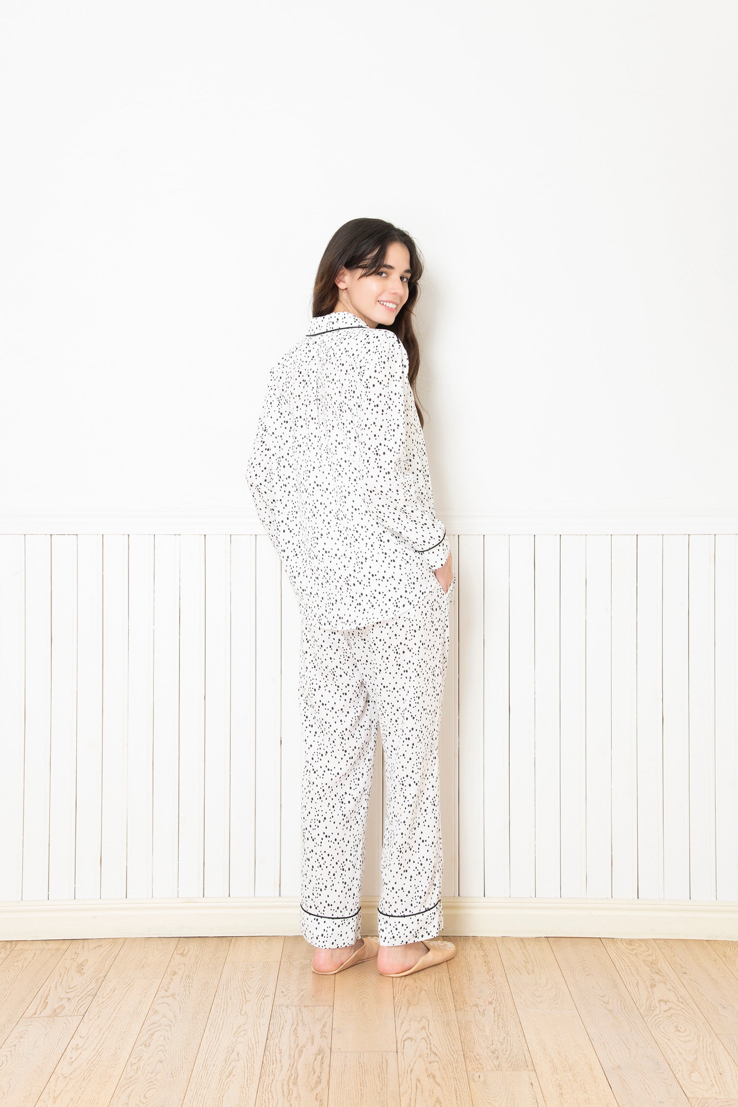 シルクタッチで上品かつ大人のパジャマに仕上がり、なめらかな肌触りを実現しています。