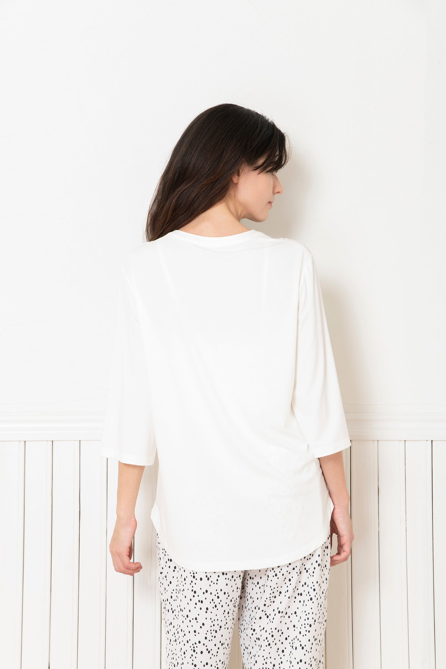 袖入れしたときのスルッと袖が通る着心地は病みつきになります。モダール素材のドレープ感があり、首の開きや、肩回りにストレスのないフィット感で作られています。洗濯での型崩れも無く、デイリーに使いたいトップスです。どんなシーンでも使いやすい、着心地の良いアイテムです。