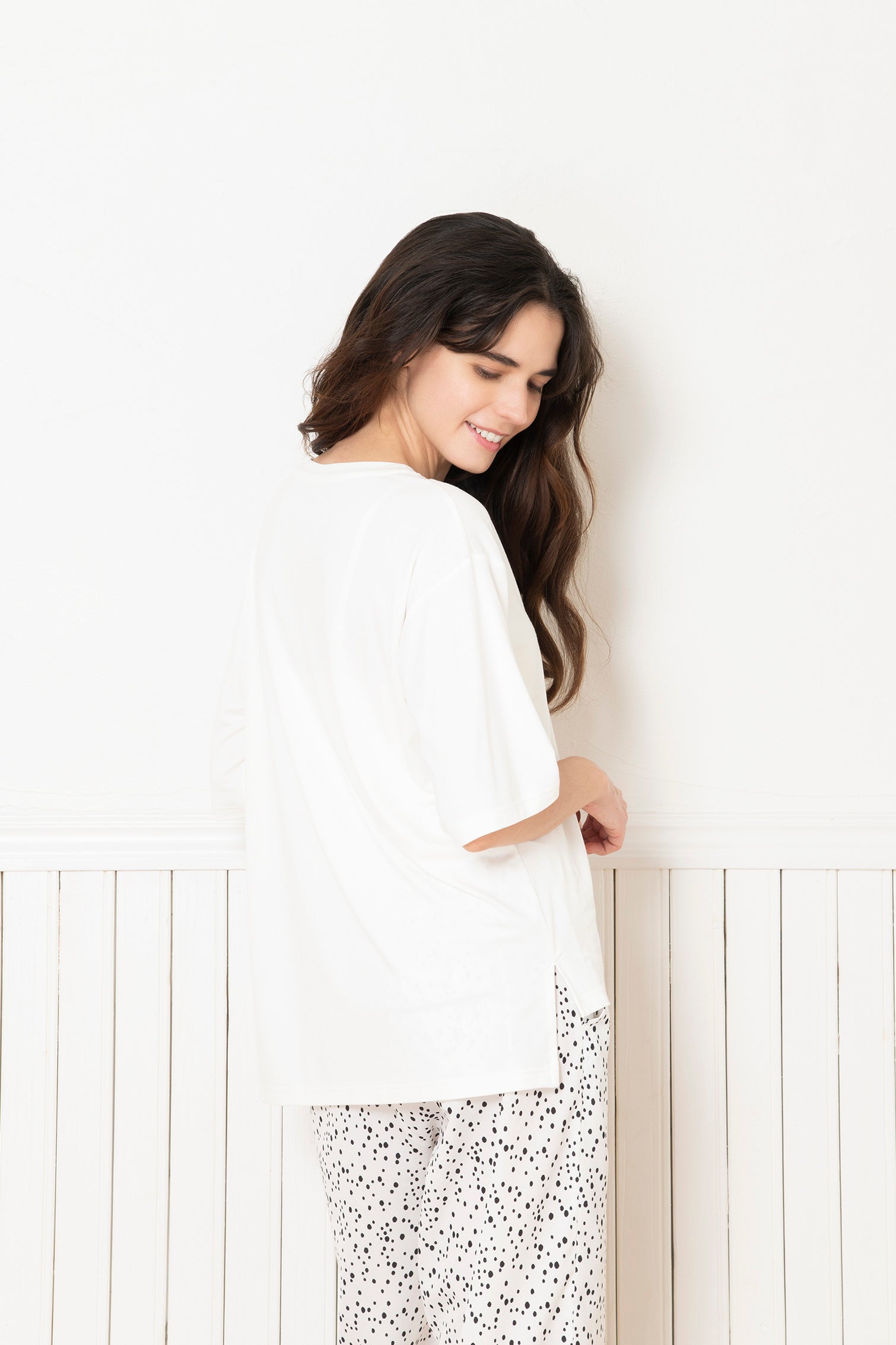 ・ヒララの柄のパンツやリブパンツのボトムに合わせて、リラックススタイル。