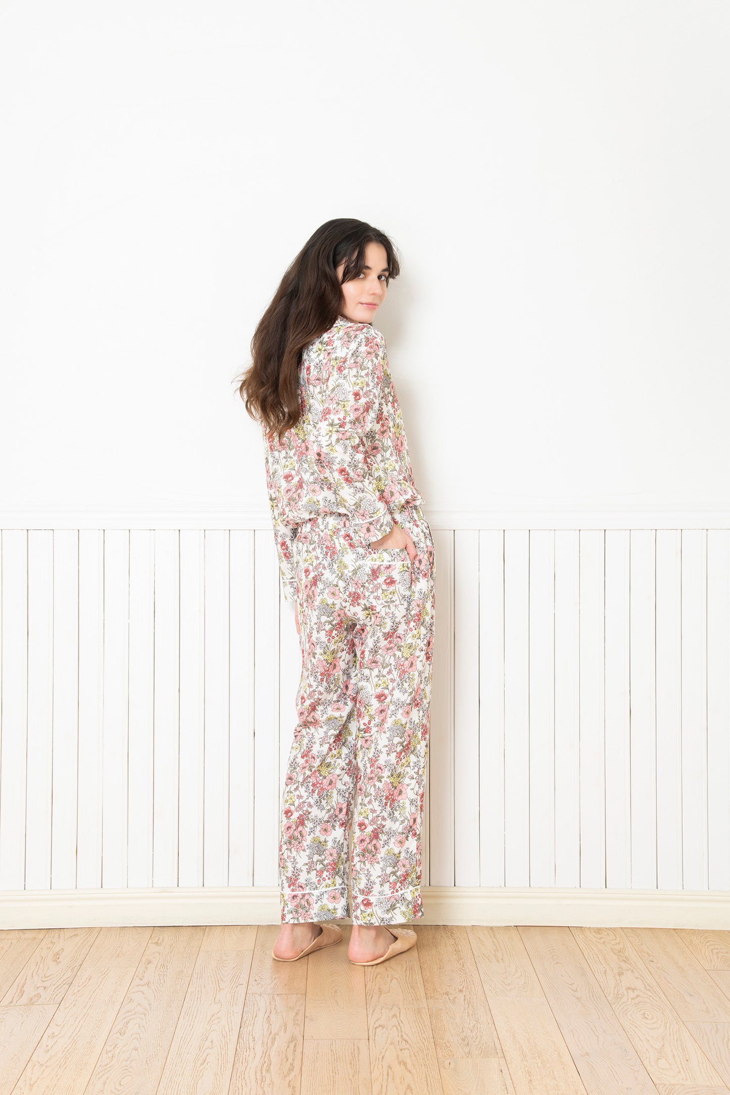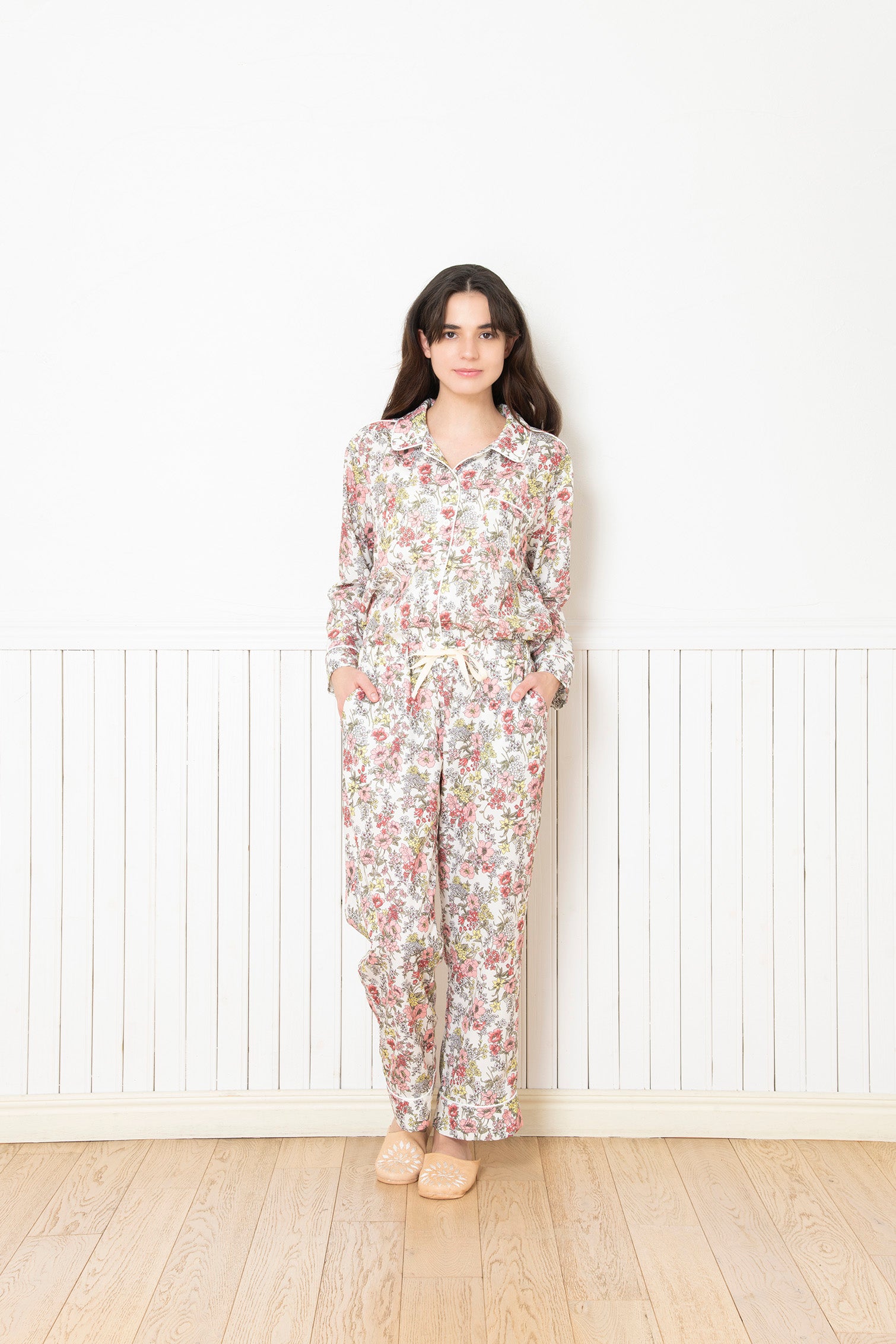 シルクタッチで上品かつ大人のパジャマに仕上がり、なめらかな肌触りを実現しています。上品なフラワープリントがトレンドを感じさせてくれます。新柄の花柄が大人可愛いおうち時間を演出します。