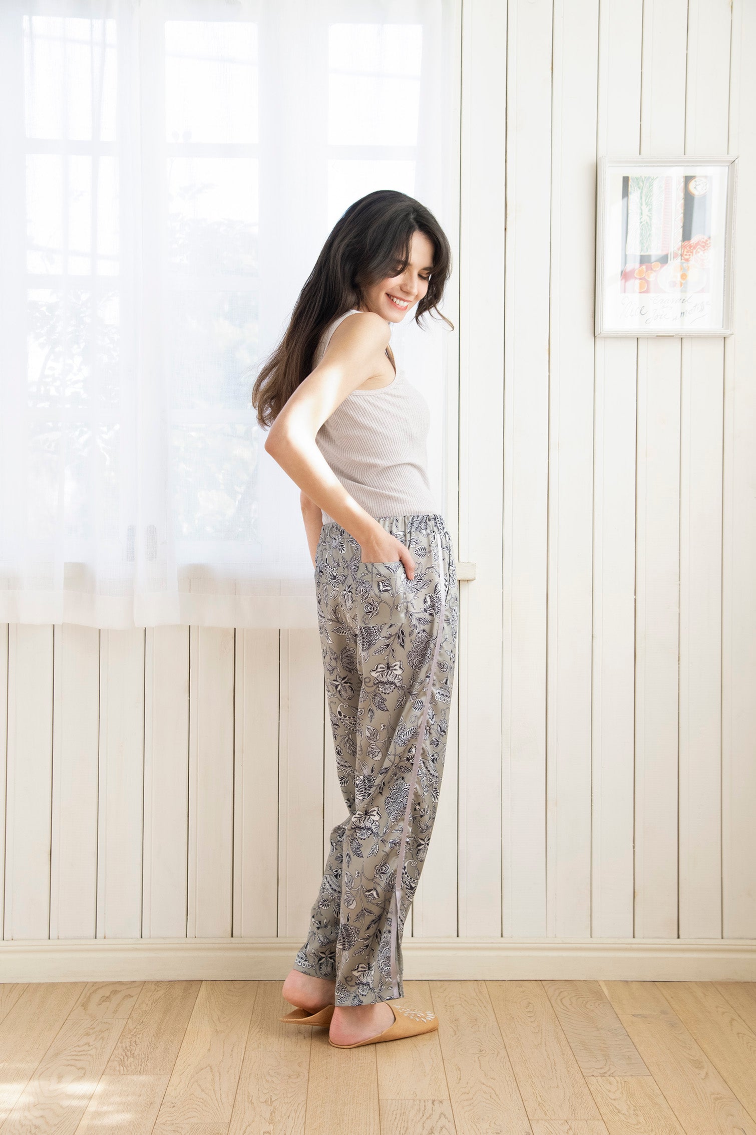 おうちでのリラックスタイムに、パジャマのボトムスとして、近所のお出かけやちょっとした買い物に、旅行先でのお洒落に、便利に使えます。サイドに施されたラインテープと裾のスリットが、他には無いリラックスウェアを演出。