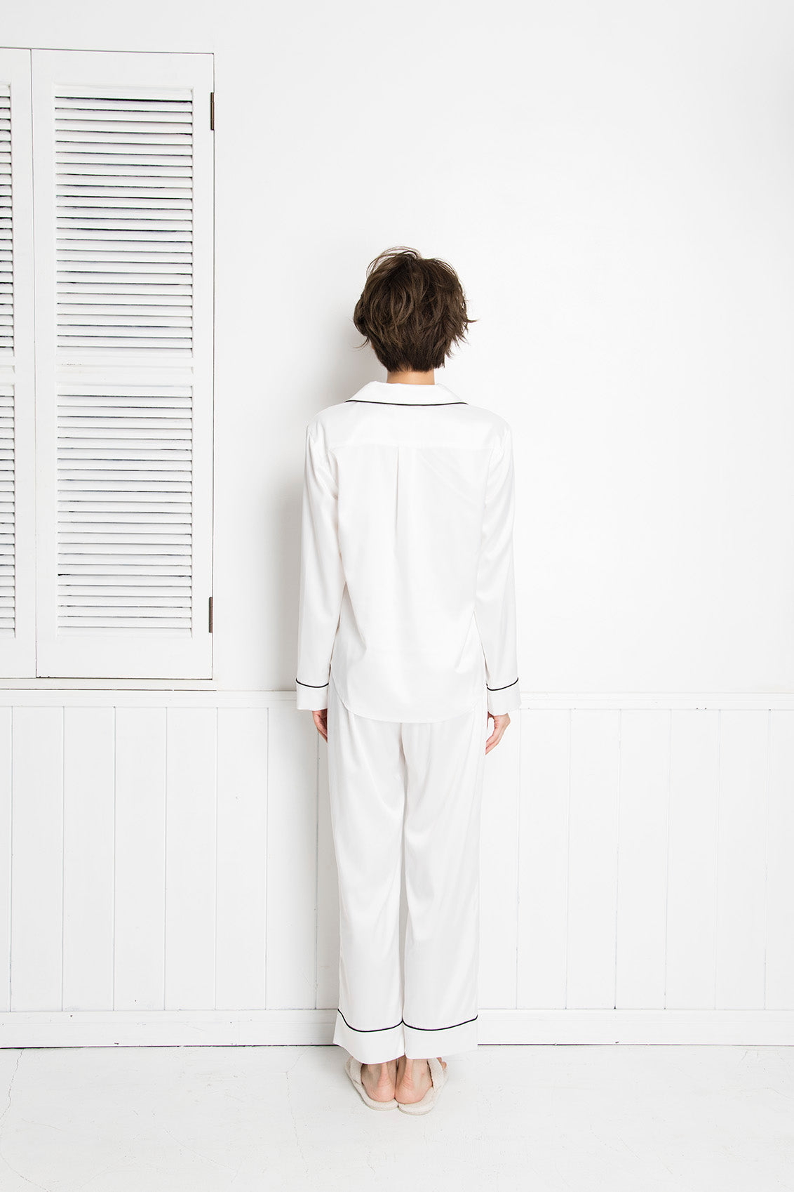 シルクタッチで上品かつ大人のパジャマに仕上がりました。サテン生地なので光沢があり、なめらかな肌触りを実現しています。