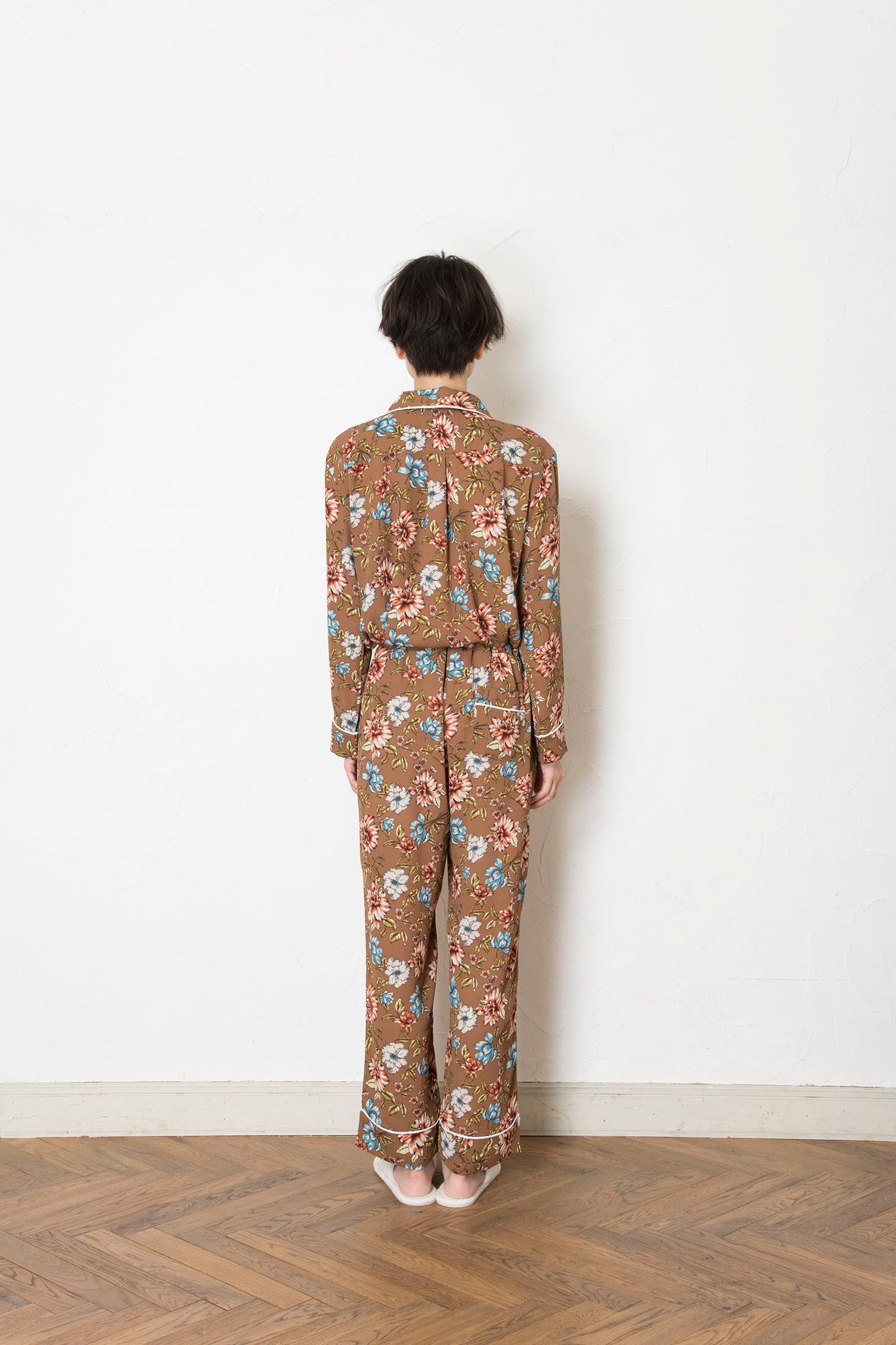 ヴィンテージ風なキャメル色にブルーの花がスパイスに。